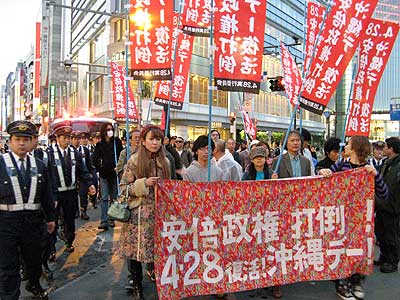 宣伝カーのコーラーの晴朗、澄明な演説、スローガン斉唱は道行く人々を立ち止まらせ、じっと聞き入らせていましたし、デモ隊脇に付くトラメガを持つ、デモ指導員の、修練されたデモ隊、シュプレヒコールは、元気がよく、調子がまとまった、勢おいのあるものでしたし、それに「安倍内閣打倒!4・28沖縄デー復活!」の横断幕、のぼりは凄く目立ち、「安倍内閣打倒!米軍は沖縄からアメリカに帰れ!沖縄をヤマト日本の下積みに置き続けるな!」のシュプレヒコールは新宿の町並みに撃ち込まれて行き、デモ隊周辺の新宿環境を騒然とさせました。